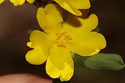 Hibbertia ovata is a species of flowering plant in the family Dilleniaceae and is endemic to Western Australia. It is an ascending or erect, spreading shrub that typically grows to a height of 10–60 cm (3.9–23.6 in). It flowers from July to November and has yellow flowers.[2] It was first formally described in 1845 by Ernst Gottlieb von Steudel in Lehmann's Plantae Preissianae.[3][4] The specific epithet (ovata) means "wider below the middle", referring to the leaves.[5]