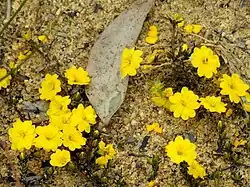 Hibbertia pustulata is a small shrub that typically to a height of up to 15 cm (5.9 in) long and has more or less glabrous foliage. The leaves are more or less linear, mostly 6.0–7.5 mm (0.24–0.30 in) long, 0.6–0.8 mm (0.024–0.031 in) wide on a petiole 0.2–0.6 mm (0.0079–0.0236 in) long and with the edges rolled under. The flowers are arranged singly on the ends of branches with a triangular bract 0.7–1.1 mm (0.028–0.043 in) long at the base. The five sepals are joined at the base, the outer sepal lobes 5.9–6.3 mm (0.23–0.25 in) long and 2.5–2.6 mm (0.098–0.102 in) wide, the inner sepal lobes 3.2–3.4 mm (0.13–0.13 in) wide. The five petals are yellow, egg-shaped with the narrower end towards the base with a notch at the tip, 7.6–9.3 mm (0.30–0.37 in) long and there are four stamens fused at the base on one side of the two carpels, each carpel with four to six ovules. Flowering mainly occurs from August to October.[2][3]