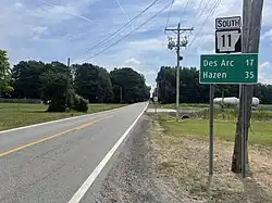 Highway 11 formerly continued past its current southern terminus. The route went south to Hazen, and continued south into Arkansas County as early as 1935[6] and as late as 1992.[7] Most of the route was paved by 1963.[8]