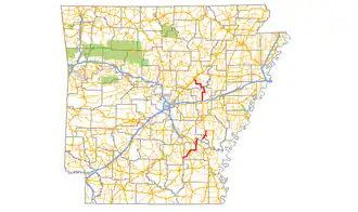Arkansas Highway 11 (AR 11) is a designation for four state highways in Arkansas. One segment of 9.57 miles (15.40 km) runs from U.S. Route 63 (US 63) at Pansy north to US 425 south of Star City. A second segment of 22.42 miles (36.08 km) runs from US 425 in Star City north to Huff's Island Public Use Area. A third segment of 12.83 miles (20.65 km) runs Highway 88 at Reydell north to US 165 west of Eldridge Corner.[2][3] A fourth segment of 37.52 miles (60.38 km) runs from I-40 in Hazen north to Highway 367 in Searcy.[4]