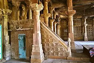 The qibla portico, or the prayer hall, is divided into three aisles parallel to the qibla wall separating each aisle from the other by a row of columns (arcade). The central aisle features the largest slab among them, covering five shallow domes of the same height except for the one in the middle, which covers the main mihrab area. It rises about 2.1 metres (7 ft) higher than the others and is distinguished by a Jali screen in the square area; the domes stand on eight pillars in the central aisle.[1] The Jali screen in the square area of the central dome allows sunlight to enter towards the area of the mihrab, in addition to serving as a ventilation and air purification mechanism. The qibla wall contains five mihrabs, and the main mihrab is located in the central Qibla wall. Only three mihrabs which are in the central have buttresses outside the qibla wall,[1][7] which serve as architectural supports for the qibla wall. The mihrabs are distinguished by their intricate micro-architectural decoration, which is unique among surviving mosques in Western India. The mihrabs feature a coherent and self-referencing micro-architectural decoration, including miniature copies of the mosque's central mihrab above the entrance door.[8] The mosque had inscriptions which were filled the panels over the mihrabs, but all of them disappeared, except the foundation inscription at the top of the main mihrab, which contained the name of the patron and the name of the Sultan in Delhi, the capital of the Sultanate. The foundation inscription is one of the most essential inscriptions in the Gujrat area, but it was formed in poor calligraphy. The inscription mentions another significant name which is the architect of the mosque ‘Abd-al-Karim Latif.[1]