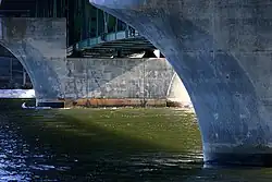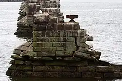 The original railway bridge immediately downstream of the new highway bridge was dismantled and the iron structure was scrapped, although the stone piers were left in place. These became a nesting site for cormorants and terns for the next three decades (1960s to 1990s). Ice and wind and wave damage by the turn of the 21st century had caused the majority of the old piers to collapse and are now mostly invisible from the bridge.