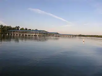Hillsdale Dam, impounding the Big Bull Creek to create the V-shaped reservoir, was completed in 1982 as a flood control project of the United States Army Corps of Engineers.[2] Fix link* The reservoir has a normal storage capacity of 76,000 acre-feet.[3] No hydroelectric power is generated by the earthen dam. Recreational facilities include Hillsdale State Park, opened in 1994.[4]