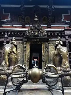 On the courtyard side the entrance is flanked by two golden elephants standing on tortoises. Above the door is a gilt copper torana. This torana was originally located at the main shrine, but was replaced there by a silver copy, donated during the reign of king Prithvi Bir Bikram Shah (1881-1911).[10]