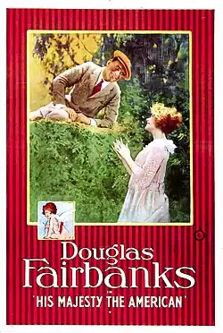 His Majesty, the American is a 1919 American silent comedy film directed by Joseph Henabery and starring Douglas Fairbanks.[2] It was the first film produced for distribution by United Artists, and was released in the U.K. as One of the Blood. Prints exist in the film holdings of Cohen Media Group (Raymond Rohauer collection) [a 35mm positive]; in the film holdings of EmGee Film Library [a 16mm reduction positive]; and in private film collections [a 16mm reduction positives].[3][4]