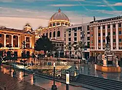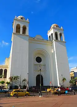 Panoramic view from Plaza Gerardo Barrios with National Palace from the west, and the Metropolitan Cathedral from the north in the historic centre of San Salvador.