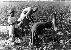 After emancipation and the passage of the thirteenth amendment, Black slaves were legally freed, but most of them lacked any kind of material wealth and were thus led into other oppressive relationships.[9] Many Black agriculturists were subjugated to land tenure agreements and working as sharecroppers, tenant farmers, and within the crop-lien system.[10] Southern black cotton farmers faced discrimination from the north. Many white Democrats were concerned about how many of African Americans were being employed in the US cotton industry and the dramatic growth of black landowners.[11][12] They urged white farmers in the south to take control of the industry, which from time to time resulted in strikes by black cotton pickers; for instance Black people led by the Colored Farmer's Association (CFA) strikers from Memphis organized the Cotton pickers strike of 1891 in Lee County in September, which resulted in much violence.[2]