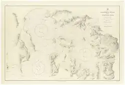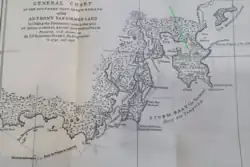 The country on the eastern side of the bay, is stony; and, wherever we landed, is wretchedly barren. The islands have a better appearance. Smooth Island, contains about one hundred acres of ground, that might answer for a garden: its soil is shallow and sandy.[8][9]