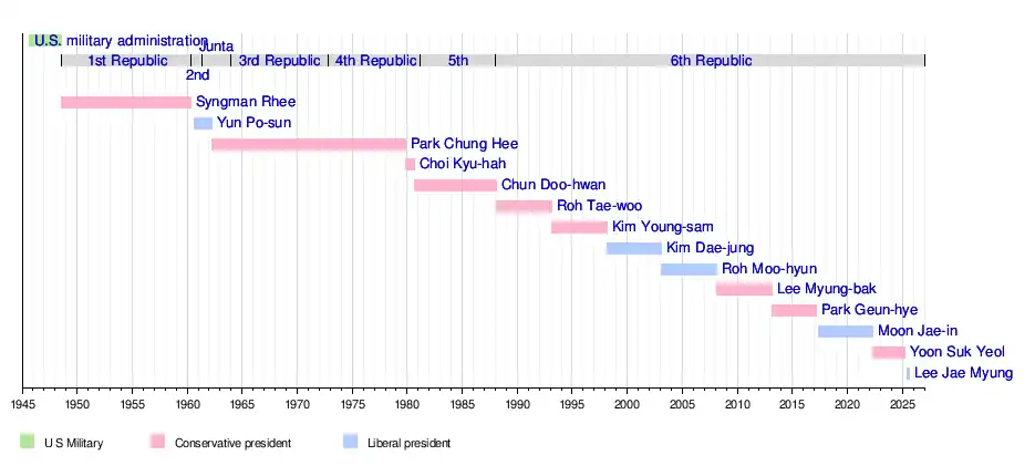 The Sixth Republic was established on 25 February 1988 and remains the current — and by far the longest-lasting — polity of South Korea.[90]