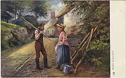 Young people's courting would take place in conjunction with ordinary daily activities, such as accompanying each other to church or performing chores. Opportunities for privacy, such as gathering berries and tending far-away fields, were welcomed by the couples. Despite the watchful eyes of the families and communities, it was not uncommon for courting couples to engage in premarital sex and many colonial brides were pregnant on their wedding day.[4]