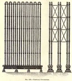 Water-cooled condensers were mainly constructed from riveted mild steel plates (which form the outer shell) and steel or wrought-iron tubes. There were two distinct types used: