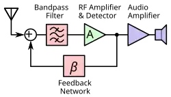 In the regenerative receiver the loop gain of the feedback loop was less than one, so the tube (or other amplifying device) did not oscillate but was close to oscillation, giving large gain.[106] In the superregenerative receiver, the loop gain was made equal to one, so the amplifying device actually began to oscillate, but the oscillations were interrupted periodically.[90][110] This allowed a single tube to produce gains of over 106.