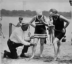 Public nudity was a major concern in designing early swimwear. It was a major factor behind the non-participation of American women in the 1912 Olympics.[13] At those Games, British women wore full-body silk suits of such a volume that they could be passed through a wedding ring. The suits were complemented by bras and bikini-style briefs as they became transparent when wet. Women's coaches were rare at early Olympics, and to further reduce the chances of harassment, women were accompanied by chaperones.[14]
