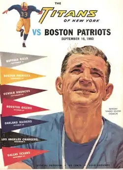 Baugh invited some 100 players to the Titans' first training camp, which opened at the University of New Hampshire on July 9, 1960.[13] As NFL teams cut players from their training camps, many were invited to the Titans' or other AFL teams' training camps as the teams sought to fill their 35-man rosters.[14] The franchise's first preseason game took place on August 6, 1960, against the Los Angeles Chargers at Los Angeles Memorial Coliseum. The Titans kicked off to begin the game, and Chargers running back Paul Lowe returned the kick 105 yards for a touchdown. New York lost, 27–7.[15] On September 11, 1960, the opening regular season game was played in a heavy downpour, the remains of Hurricane Donna. Water poured off Coogan's Bluff, situated above the Polo Grounds, swamping the field, which had poor drainage. The Titans' offense was less affected by the mud than that of the visiting Buffalo Bills. The Titans won the game 27–3 before a crowd of 9,607 (5,727 paid attendance).[16] The following week New York played another home game, against the Boston Patriots. On the first of many occasions when the team would lose a game after taking a big lead, the Titans were ahead 24–7 in the second half. With the lead reduced to 24–21, the Titans punted from deep in their own territory with seconds left. The punter, Rick Sapienza, fumbled the snap, and the Patriots recovered in the end zone for the victory.[17] The following week, with the Titans playing at the Denver Broncos, New York blocked a punt on the final play to win the game.[18] In their fourth game, New York had a two-point lead when it fumbled with fifteen seconds left against the Dallas Texans. This set off a scramble for the ball, which the Titans recovered as time ran out. Viewers in New York were spared the harrowing ending; in a prelude to the Heidi Game eight years later, the local ABC station had switched to a Walt Disney Davey Crockett special at 6:30 p.m. Many viewers called to complain.[19]