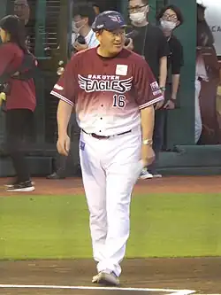 Hiraishi was kept on as full-time manager for 2019,[103] and in the offseason Ishii signed Jabari Blash and former Lions' captain Hideto Asamura.[104][105] Ginji Akaminai, however, was named as the Eagles' captain for the year.[68] Norimoto had elbow surgery in March and missed half of the season as a result.[106] Yuki Matsui, Rakuten's first-round 2013 draft pick and closer, recorded 38 saves by season's end, the most in the league,[107] and Blash and Asamura went on to hit 33 home runs each.[108] The Eagles narrowly secured the third spot in the Climax Series, but they was defeated two games to one by SoftBank in the first stage. Another managerial change was made after the loss, and Hajime Miki was promoted from farm team manager.[103] Furthermore, Eigoro Mogi replaced Ginji as captain after only one year.[68]