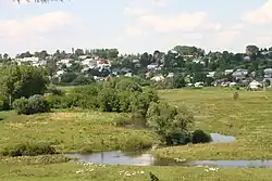 On the river banks are the cities of Zbarazh and Terebovlia, the town of Velyki Birky, and the villages of Krasnosiltsi, Malyi Hlybochok, Zaluzhzhia, Chernykhivtsi, Stupky, Tovstoluh, Smolianka, and Skomorokhy of the Ternopil Raion.[1][2][5]