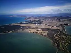 Hobart International Airport was opened in 1956 and privatised in 1988.[8] Occupying approximately 565 ha (1,400 acres) of land,[6] the airport is situated on a narrow peninsula. Take-offs and landings are inevitably directed over bodies of water regardless of approach or departure direction. The region immediately surrounding the airport remains largely unpopulated, which enables the airport to operate curfew-free services.[6]