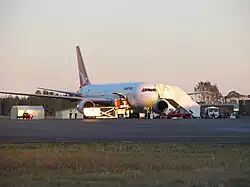 The international terminal was opened in 1983 to facilitate Trans-Tasman air traffic, although, international flights began at the airport in December 1980 with Ansett and TAA offering services to New Zealand.[6][10] In 1985 the terminal was upgraded, along with the runway, to provide limited 747 operations.[6][10] Between 1998 and 2020, no regular international flights serviced the airport[16] after Air New Zealand suspended their operations from Christchurch.[26] Direct international flights recommenced in April, 2021 with Air New Zealand to Auckland operating twice weekly in winter and thrice weekly over summer. The terminal is also used by Skytraders for flights to Antarctica and occasional charter airline flights.[6][27] The terminal's apron has a single wide-body parking bay overlapping two narrow-body bays. This bay is able to accommodate large wide-body aircraft up to and including Boeing 747-400 and 777–200.[6] The international terminal's apron is used primarily for domestic operations and Skytraders' seasonal Antarctic flights as well as the Air New Zealand flights to Auckland.[6]