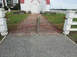 The entrance to the property is paved with ceramic bricks and features a wrought iron gate that was taken from the old Hobsonville School before its demolition.[1]