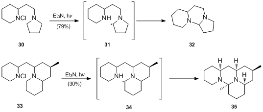• M. Kimura and Y. Ban demonstrated that adjacent nitrogen atoms can stabilize radical species generated by H-atom abstraction and permit this step to take place under weakly basic conditions[20][21] They reported that far better yields are obtained on photoirradiation in the presence of triethylamine, which neutralizes the hydrogen chloride generated by cyclization. M. Kimura and Y. Ban employed the modified conditions of the Hofmann–Löffler–Freytag reaction to the synthesis of dihydrodeoxyepiallocernuine 35.[20]