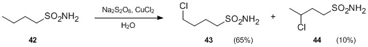 • Another variation of the Hofmann–Löffler–Freytag reaction involves sulfonamides in place of N-haloamines. In the presence of persulphates and metal salts, sulfonamides can undergo intramolecular free-radical funcionalization to produce γ- and δ-chloroalkenylsulfonamides under neutral conditions. For instance, upon treatment with Na2S2O8 and CuCl2, butylsulfonamide 42 was transformed to 4-chlorobutylsulfonamide 43 and 3- chlorobutylsulfonamide 44 in the absence of acid.[23]