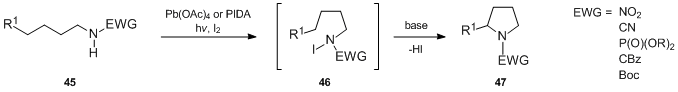 • The most important variation of the Hofmann–Löffler–Freytag reaction is the Suárez modification. In 1980, Suárez et al.[24] reported a process using neutral conditions for the Hofmann–Löffler–Freytag reaction of N-nitroamides. Further developments of this transformation have led to the expansion of the substrate scope to N-cyanamides, N-phosphoramidates and carbamates.[25][26][27][28][29] All these species react with hypervalent iodine reagents in the presence of iodine (I2) to generate nitrogen-centered radical via homolytic fragmentation of a hypothetical iodoamide intermediate. Thus formed N-radicals might participate in an intramolecular 1,5-hydrogen abstraction reaction from unactivated carbons, the result being the formation of pyrrolidines.
