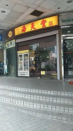 Every Hoi Tin Tong Store has a reddish and yellowish signboard with their Chinese brand name "海天堂" on it.