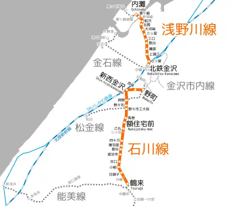 • Asanogawa Line (浅野川線): Uchinada — Awagasaki-Kaigan