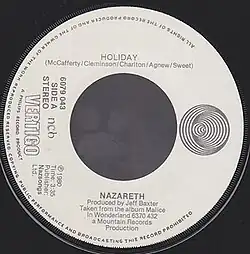 "Holiday" is a song by Nazareth from their 1980 album Malice in Wonderland. The single reached No. 87 on the Billboard Hot 100,[3] their only charting song apart from "Love Hurts". The music video featured the arcade game Super Road Champions. The song has also appeared on the 2002 compilation album, Nazology: Best of Nazareth.[4] AllMusic's Donald Guarisco gave a positive review of the song in his review of the Malice in Wonderland album.[5]