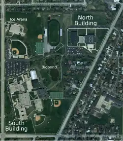 The campus is spread out and consists of two main buildings: the North and South Buildings. The South Building contains a number of sub-buildings each assigned a letter, and includes the school's radio station (WHFH) 88.5 FM Flossmoor, television station VTV, a swimming pool, gymnasium, science building, and performing arts center. The North Building has three floors and includes the school's fieldhouse. Both buildings contain a cafeteria. An ice rink is also located on the campus, owned by the local park district.