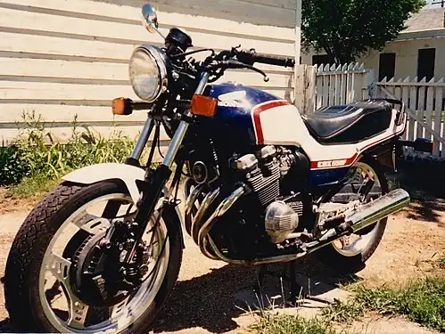 The machine was noted for its use of inboard ventilated disc brakes, the discs themselves being contained within a "drum" type enclosure.[2] Front suspension was by oil-damped telescopic fork with air assistance and incorporating an anti-dive mechanism in the left fork leg.[2] Rear suspension was by Honda's own "Pro-Link" rising rate system, which allows the suspension forces to vary in accordance with rear wheel movement.[2] The machine was equipped with transistorised ignition and electrics were 12 volt.