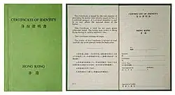 The Hong Kong Certificate of Identity (CI) was a formal travel document and passport, issued by the Hong Kong Government's Immigration Department until 30 June 1997 (See transfer of sovereignty over Hong Kong). It is no longer possible to possess a valid CI as a travel document, as all CIs have expired by 30 June 2007, though most CI holders should be eligible to hold the HKSAR Passport.