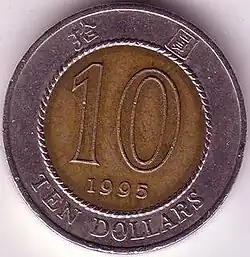 It circulates alongside the ten dollar banknote. It was first issued for circulation in 1994 to replace the $10 note, but the coin was not minted after 1997 and the Hong Kong Monetary Authority chose instead to reissue banknotes in 2002. A commemorative issue featuring the Tsing Ma Bridge was released in 1997 for the handover of Hong Kong to China. It was issued in uncirculated and proof sets.[1] It is Hong Kong's only bi-metallic coin.