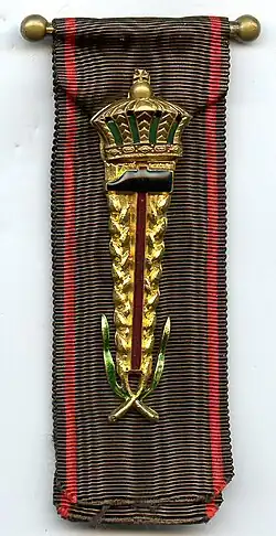 The insignia of the Honour Badge of Labour shows a vertical hammer with one ear of corn on each side enamelled in black, yellow and red, and topped by a royal crown, which is bronze, silver or gold depending on the class of the award.