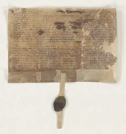 In Le Quesnoy (Hainaut) Margaret added that she would protect these nobles on 5 September 1350.[3] She stated that the signatories had fought against people living in her lands and outside. These people had attempted to evict her party from her lands, and burned and looted in her lands. She then took responsibility for what these nobles had done so far, or would do against this enemy. (Our enemies have done or will do with burning...)[9]