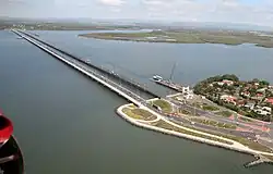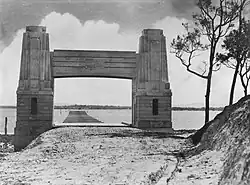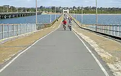 The Hornibrook Highway Bridge was a 2.685 kilometres (1.668 mi) long timber and concrete bridge that spanned Hays Inlet and Bramble Bay between Clontarf and Brighton, linking Sandgate to Redcliffe. It had identical rendered concrete portals at each end, and two rises along its length which permit small boats to pass underneath.[2]