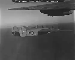 Hot Stuff was part of the 8th Air Force out of Hardwick (Station 104), England, and part of the 93rd Bomb Group, 330th Bomb Squadron. Hot Stuff flew its 25th mission on February 7, 1943, against long odds at a time when many planes were being shot down. Hot Stuff became the first heavy bomber and crew, and first B-24, in the 8th Air Force to complete twenty-five missions in Europe in World War II. It reached its 25th mission milestone three-and-a-half months before the widely celebrated Memphis Belle. After Hot Stuff completed thirty-one missions, it was selected to return to the United States on May 3, 1943, to tour the country and help sell war bonds.[1]