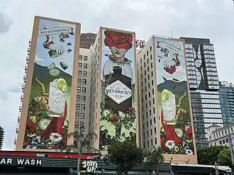 The sides of the hotel serve as canvases for hand-painted advertisements, a practice that dates back to the 1980s.[25] They have been painted by the company Walldogs, who have worked with the hotel since 1994 and have done advertisements campaigns for Bethesda Softworks, Square Enix, and DICE.[26][27][28] In 2008, the hotel briefly switched to using vinyl wallscapes, but the use was stopped due to the city's crackdown on vinyl billboards lacking proper permits.[29] The back of the building features a mural depicting plants, created by muralist Bella Gomez.[30][31]