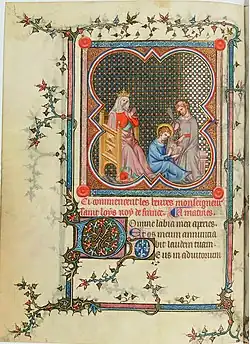 The Hours of Jeanne de Navarre is an illuminated book of hours with miniatures painted by Jean Le Noir. The book was commissioned by Philip VI of Valois and his wife, Blanche de Navarre, for Jeanne de Navarre, Queen of Navarre. The book was created sometime between 1336 and 1340 and is now in the Bibliothèque Nationale, Paris.[1]