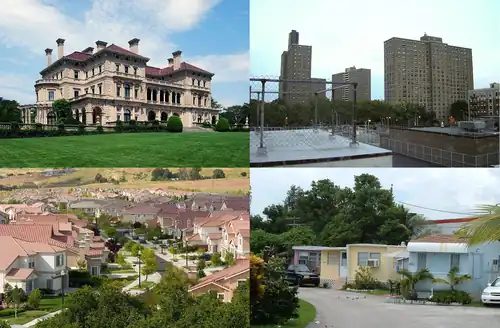 Housing as shelter is one of the "basic needs" of humans, offering protection against the elements.[4] It also provides a place of privacy away from the public eye where daily activities can take place. Residents often have personal attachment to a house, making it a home. A home's location, style and access to schools, parks, and other amenities can align a household to a greater community to reinforce cultural or religious bonds. These characteristics can also reinforce residential segregation and unequal access to amenities.[5]