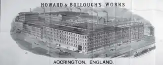 The firm of Howard and Bleakley was founded in 1851 with four workers;[1] in 1856 Bleakley retired and the partnership was changed to Howard & Bullough. John Bullough had perfected a self-acting temple on his handloom, and with William Kenworthy at Brookhouse Mills had been responsible for the Lancashire Loom.[2] By 1856 they employed 150 workers; John's son James joined in 1862. They initially concentrated on looms, but eventually expanded to manufacture the complete range of machinery used in a cotton mill.