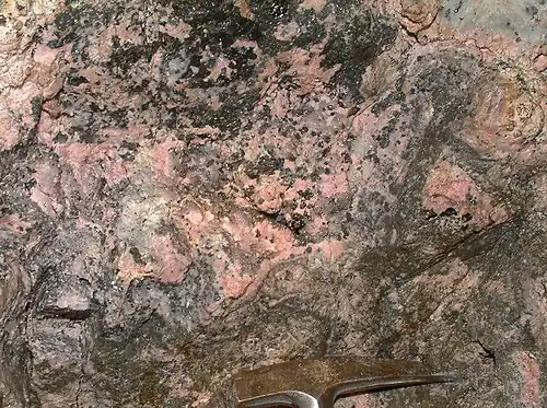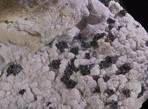 The Huarón Mining District is one of the richest polymetallic (Zn-Pb-Ag-Cu-(Au)) deposit clusters in Peru. It is located 20 km SSW of Cerro de Pasco, in the Huayllay District, Pasco Province, Pasco Department, between 4500 and 4700 m.a.s.l. The Huarón Mining District belongs to the Miocene polymetallic belt of the Central Andes.[1][2] Hydrothermal mineralization occurs as predominantly in N-S to NNW-SSW and E-W veins as well as in "mantos" replacing favorable sedimentary rock. Epithermal hydrothermal fluids are thought to be derived from quartz-monzonitic intrusions tentatively dated at 7.4 Ma (K-Ar on adularia).[3] The most important economic minerals are tennantite‐tetrahedrite (containing most of the silver), sphalerite, galena, and chalcopyrite. Silver is also found in pyrargyrite, proustite, polybasite, and pearceite. In the central copper core of the Huarón deposit, enargite occurs.[4] Main gangue minerals are pyrite, quartz, rhodochrosite, and calcite.[4]