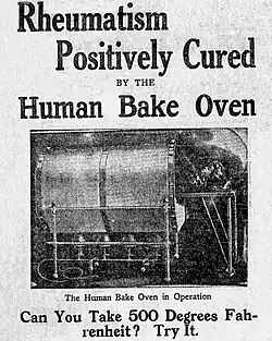 The human bake oven, also known as the Tallerman–Sheffield treatment,[1] Tallerman treatment[2] or Tallerman's apparatus,[3] was a Victorian era medical contraption used to treat various ailments, primarily joint problems such as rheumatism. Based on the knowledge that heat is often useful in alleviating pain, patients would be placed in the iron lung-like machine and then baked at temperatures typically around 138°C (280°F) but sometimes as high as 204°C (400°F). The sensation was variously described as either quite pleasant or feeling like one was being roasted alive.