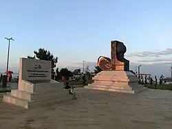 The friendship park is situated about 2–3 km (1.2–1.9 mi) northeast of the town on the left-hand side of the road to Kaposvár and is accessible by bus.[7] The park measures about 60 m × 60 m (200 ft × 200 ft) in dimensions making an area of around 1 acre (4,000 m2). Open to visitors all year long, the park has a triumphal arch-like gate and is walled by a waist-high oriental ornamented fence. 6.50 m (21.3 ft) high monumental head statues of the military rivals Nikola IV Zrinski and Sultan Suleiman, who died at the site, are erected side by side on shared plinth in the centre of the park. The sculptures in bronze, created by Turkish sculptor Metin Yurdanur, and the marbles were given by the Turkish Ministry of Culture and Tourism. The construction cost about HUF 60 million (approx. US$269,000).[8] The park area itself is leased to the Turkish government for a symbolic annual rental price of HUF 1 for a time span of 99 years, beginning 1994.[1][5][6]