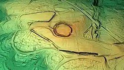 Ironstone extraction began at the hill fort in about 1883,[3] after an attempt to have the site protected under the Ancient Monuments Act of 1882 failed due to the cost of compensating the landowner. Many of the fort's internal features were destroyed, but the work revealed up to 300 pits which, according to the curator of Northampton Museum in 1887, contained "numerous artefacts that now comprise one of the finest collections... of Prehistoric antiquities in England". The finds included iron weapons and tools, bronze brooches, pottery, glass and around 159 quern-stones. All were given to the town's museum.[2]