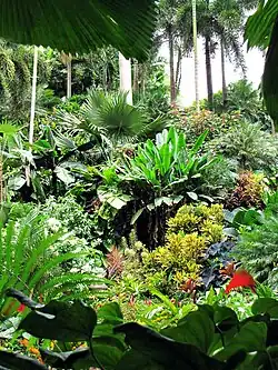 Hunte's Gardens is characterised by a multi-level environment consisting of winding footpaths, prominent clearings, and secluded resting areas. Hunte curated the garden with the goal of providing visitors with diverse plant groupings and themed garden rooms. It is designed to showcase a wide variety of tropical plants sourced from across the world, including royal palms, ginger lilies, heliconias, and bird-of-paradise flowers.[1] In addition to its botanical features, the site retains elements of its colonial past, with stone buildings and structures that date back several centuries. The central structure of the garden is Hunte's residence, a converted stable filled with antique furnishings and open-air rooms that visitors may tour.[1]