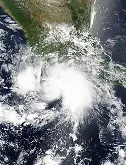 The possibility of tropical cyclogenesis from a tropical disturbance south of Mexico was first mentioned by the National Hurricane Center (NHC) on July 6.[2] A westward-moving tropical wave crossed Central America and entered the Eastern Pacific on July 8.[1] The next day, the wave spawned a weak area of low pressure while south of Guatemala.[3] On July 10, the disturbance quickly organized, with convection, or thunderstorms, more concentrated near the center of the low.[4] Early on July 11, satellite images showed that the disturbance was consolidating into a tropical depression.[5] Consequently, at 12:00 UTC, the NHC declared the system Tropical Depression Five-E while located roughly 345 mi (555 km) south-southeast of Acapulco, Mexico.[6] The depression gradually organized, developing banding features around the eastern portion of the system.[7] Late that day, the depression attained tropical storm intensity and received the name Dolores, as a small central dense overcast developed near the low-level circulation center. Additionally, a ship near northeastern quadrant reported sustained winds at 40 mph (64 km/h).[1][8] Despite environmental conditions that were nearly ideal and largely favorable for strengthening, moderate northwesterly wind shear caused by an upper-level trough initially prevented much intensification. The storm slowly strengthened on July 11 while moving northwestward, several hundred miles off the coast of Southwestern Mexico.[1] The cloud pattern of the storm grew more and more organized throughout July 12, with symmetric and organized convection over the center, signalling less impediment from the shear, though outflow remained restricted over the western portion of the system.[9]