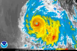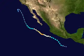 The strengthening trend was short-lived, however, as the cloud tops in the eyewall began to warm soon after it achieved peak intensity.[15] As Dolores approached Socorro Island, the cyclone underwent an eyewall replacement cycle and began to steadily weaken. The storm exhibited winds of 105 mph (170 km/h) as it passed within 20 mi (32 km) of the island. After completing the cycle on July 16, Dolores exhibited annular characteristics, with a symmetric and wide eye. The NHC described the eyewall as thick and "donut-shaped". Re-strengthening did not commence, as Dolores had moved over cooler sea surface temperatures.[16] Cloud tops briefly cooled, usually signaling the redevelopment of strong thunderstorms, but dry air had started to mix into the circulation.[17][18] Throughout the early hours of July 17, Dolores's structure continued to decay, with an eye no longer apparent and convection waning.[19] By 12:00 UTC, Dolores had deteriorated into a tropical storm, with no convection near its center.[20] With increasing northerly shear, the system eventually degenerated into a post-tropical remnant low about 300 mi (480 km) west of the Baja California coast on July 18. The remnant low slowly curved southward, before dissipating on July 22, a few hundred miles west of San Diego, California.[21][1][22]