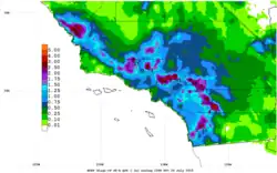 As a tropical cyclone, Dolores produced no impacts in the United States. However, a surge of moisture associated with the remnants of the cyclone moved northward ahead of a trough off the Californian coast between July 17 and 18.[1] The interaction of the moisture with the trough brought record–breaking rainfall and heavy thunderstorms to Southern California, including major cities such as San Diego and Los Angeles. Record monthly rainfall totals include 1.70 in (43 mm) in San Diego, 1.30 in (33 mm) in Los Angeles, and 1.16 in (29.5 mm) in Paso Robles. In the foothills and mountains of east San Diego County, rainfall exceeded 4 in (100 mm).[24][25] This rain assisted firefighters in containing the North Fire,[26] but also resulted in debris flows and rock slides that damaged about 90 homes and submerged cars.[1] The San Diego River reached levels of 8.9 ft (2.7 m)—just below flood stage—and overflowed its banks in a few areas.[1]