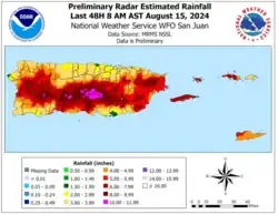 Preliminary rainfall totals in Puerto Rico from Tropical Storm Ernesto during August 14–15